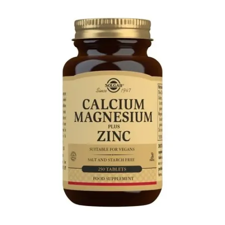 Solgar Calcio/Magnesio + Zinc es un suplemento natural que contiene tres minerales esenciales para el bienestar. Destinado a mejorar la salud de los músculos, huesos y dientes, contribuye también al óptimo funcionamiento del sistema nervioso central.