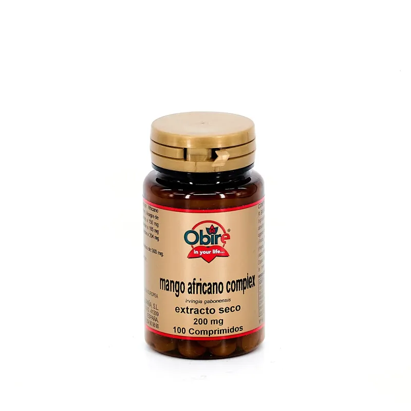 Obire Mango Africano Complex viene en un envase que contiene comprimidos con extractos secos de Mango Africano (200 mg), Acai (12,5 mg), Alcachofa (7,14 mg) y Té Verde (4,54 mg), además de Vinagre de Manzana (25 mg).