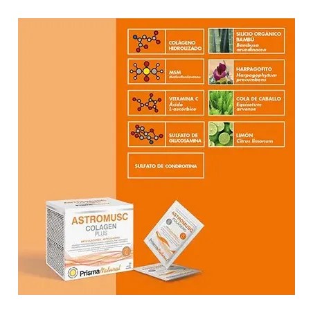 Astromusc Articulaciones es un suplemento nutricional en polvo, diseñado por Prisma Natural, para el apoyo y mantenimiento del bienestar de los músculos y articulaciones. Este producto una mezcla equilibrada de ingredientes naturales pensada para aportar nutrientes esenciales en la formación de tejido conectivo.