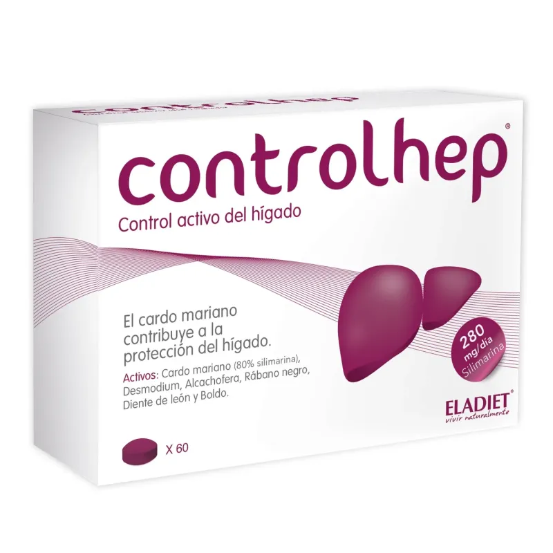 Controlhep viene empaquetado en un bote que contiene 60 comprimidos. Los ingredientes destacados en su composición son extractos de cardo mariano, boldo, desmodio, alcachofa y diente de león.