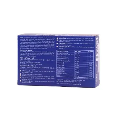 YMEA 8-en-1 es un complemento alimenticio diseñado con ingredientes como la vitamina B6, B12, C, D, salvia, maca, ácido fólico, zinc y extracto de castaña. Este producto puede proporcionar asistencia para lidiar con los síntomas comúnmente experimentados durante la menopausia como los sofocos, sudores nocturnos, cambios de humor y fatiga.